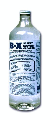 Safe Solvent for Sticky or Greasy Substances Choose this safe, non-flammable solvent to clean and remove Bird X BIRD-PROOF,a non-toxic chemical roosting inhibitor and bird repellent, as well as other sticky or greasy substances. 8 Ounce container removes bird repellent. Use on metal, wood, ceramic, masonry and most painted and other sealed surfaces. Bird-X Safety Solvent works equally well on other sticky bird repellent products. Non-Flammable Economical Water-Soluble Colorless Non-Foaming Ready-To-Use Slow Evaporating Neutral pH Free from Chlorinated Solvents Free from Chlorofluorocarbons Harmless to Clothing, Fabric and Carpeting B-X Safety Solvent works faster and easier due to exceptional dissolving power that effectively "solubilizes" the bird repellent material. In other words, B-X Safety Solvent makes the substance more soluble in water for faster cleaning and rinsing with water. B-X Safety Solvent quickly cleans bird repellent application equipment after each use. B-XSafety Solvent is an excellent degreaser for cleaning tools, benches, equipment, clothing and most surfaces. Effective on such difficult-to-remove materials and residues as: Tar Oil Grease Ski Wax Magazine Print Gum Solar Film Decals Contact Cement Spray Adhesive Ink Bathtub Decals Crazy Glue Adhesive Labels Stickers Crayon Dried Caulk Non-Skid Treads Velcro Tape Rodent and Insect Glue Traps Hot Melt Glue Screen Print B-X Safety Solvent Apply by pouring, wiping, mopping, brushing or pressure cleaning. First remove heavy repellent buildup with a putty knife or paint scraper. Then remove the residue applying B-X SAFETY SOLVENT cleaner with a brass brush and washing away with water. As an alternate method, saturate the entire area with the cleaner. After 30 minutes, rinse away the dissolved repellent with water. NON RETURNABLE. Cannot be shipped via US Mail.